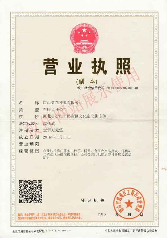 唐山荷花種業(yè)有限公司始創(chuàng)于1984年,一直秉承“科技為先,誠信為本”的發(fā)展指導(dǎo)戰(zhàn)略,注冊商標(biāo)“荷花”牌,經(jīng)過三十多年的發(fā)展,建立了從親本選育、試驗(yàn)示范、生產(chǎn)檢驗(yàn)、精選加工、推廣銷售及農(nóng)業(yè)技術(shù)咨詢一體化的經(jīng)營體系,目前擁有試驗(yàn)基地、繁育基地、制種基地、及規(guī)模化種子冷貯藏庫,完善了由科研、檢驗(yàn)、生產(chǎn)、銷售各個(gè)配套環(huán)節(jié)。荷花牌系列種子正是我們在堅(jiān)持“誠信、品質(zhì)、開拓、創(chuàng)新”的企業(yè)精神下打造的種子品牌,如今,在全國已形成強(qiáng)勢品牌效應(yīng),是一個(gè)值得信賴與具有一定影響力的種子品牌,在全國廣大用戶中贏得了良好的口碑和信譽(yù)... ...